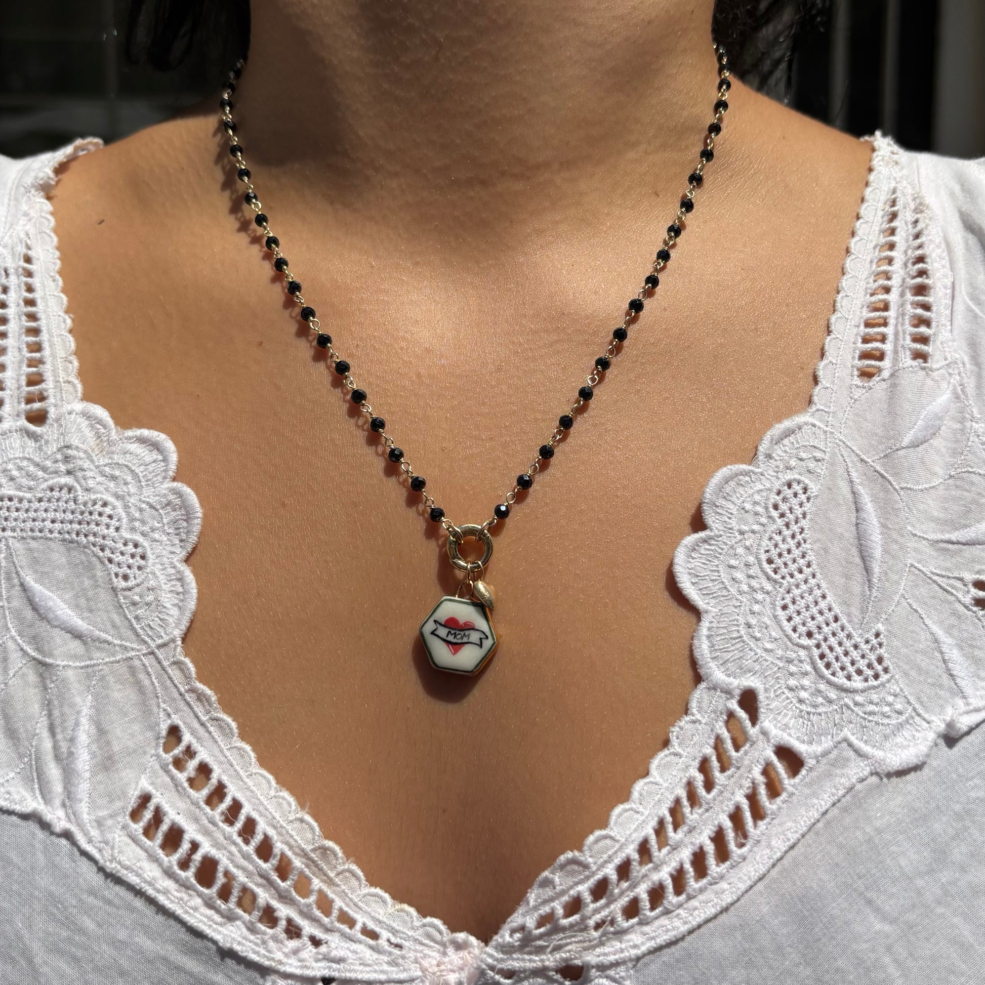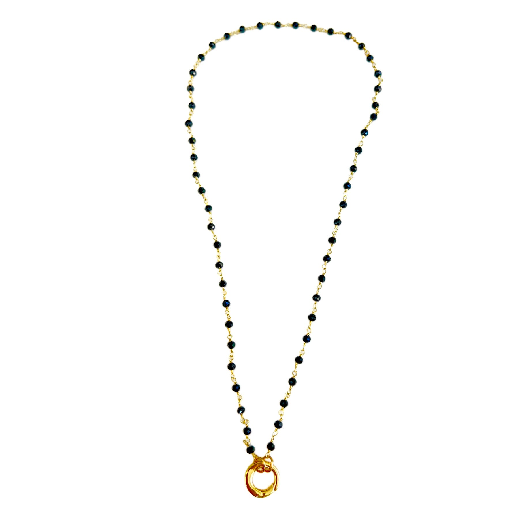 A little edge, a little elegance. This necklace features sleek black glass beads hand-strung along a delicate gold-filled chain, finished with a built-in gold-filled circular charm holder at the center—ready for you to add your favorite shá parlé charms.
