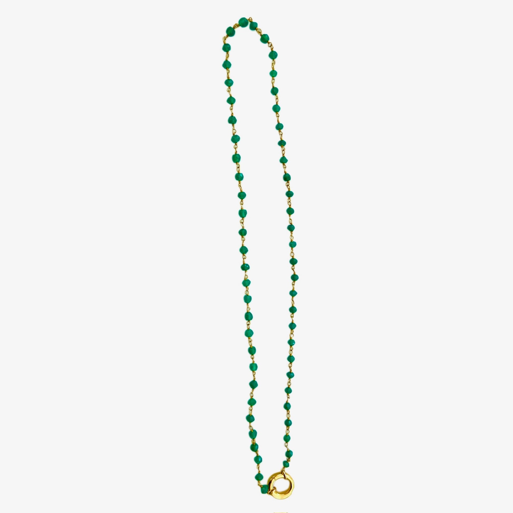 Grounded, fresh, and quietly bold. This necklace features soft green glass beads hand-strung along a delicate gold-filled chain, finished with a built-in gold-filled circular charm holder—ready to carry your favorite shá parlé charms.