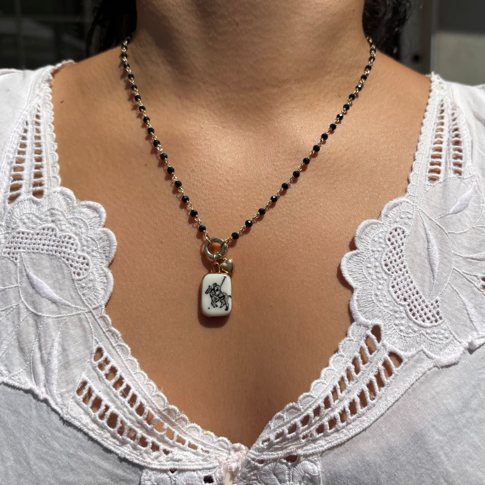Think of it as a miniature treasure—best worn with care. Treat it like fine china: delicate, beautiful, and meant to be handled gently. While the porcelain and gold-filled components will not tarnish, the 22k gold luster is a delicate finish that can wear over time if exposed to rough handling, friction, or harsh chemicals.