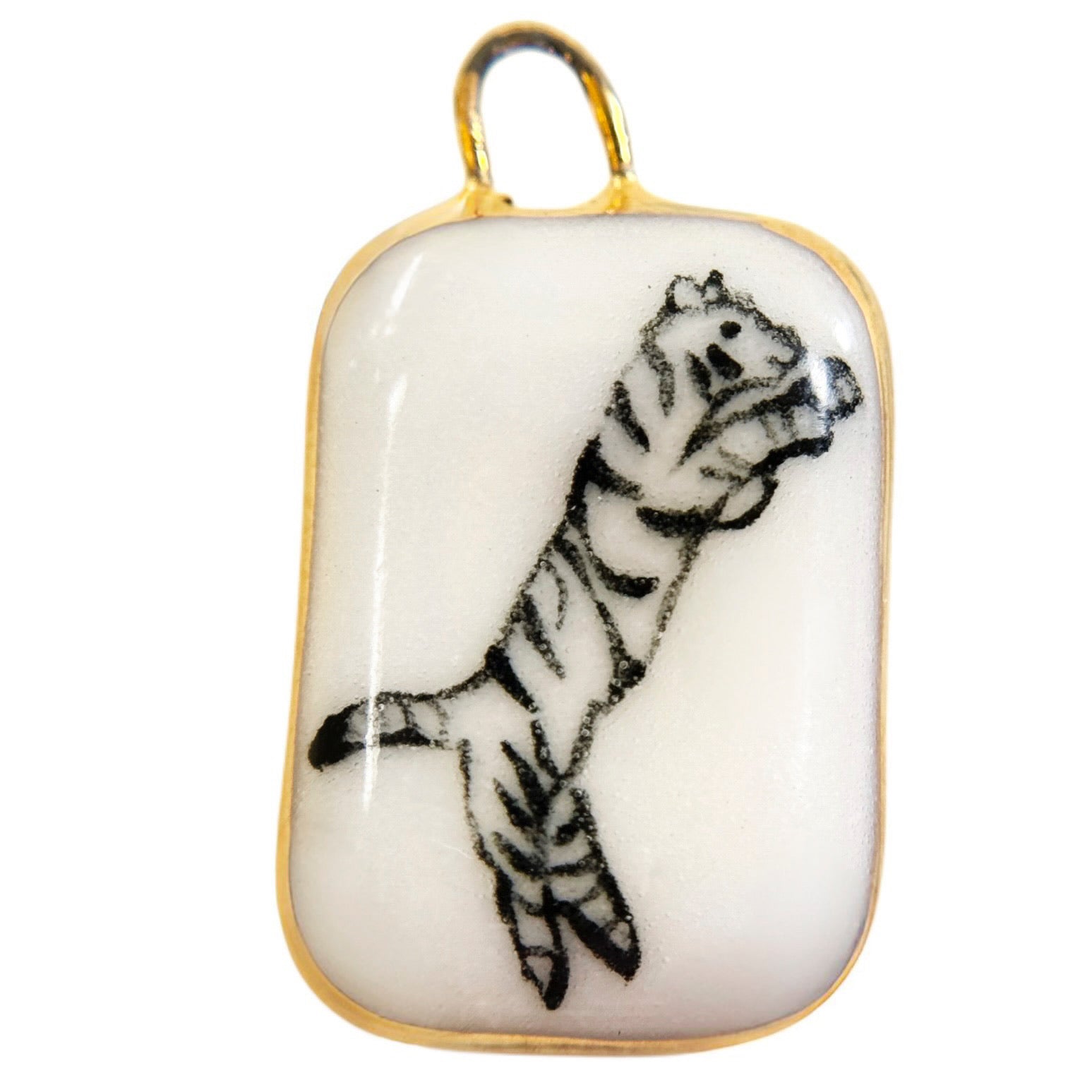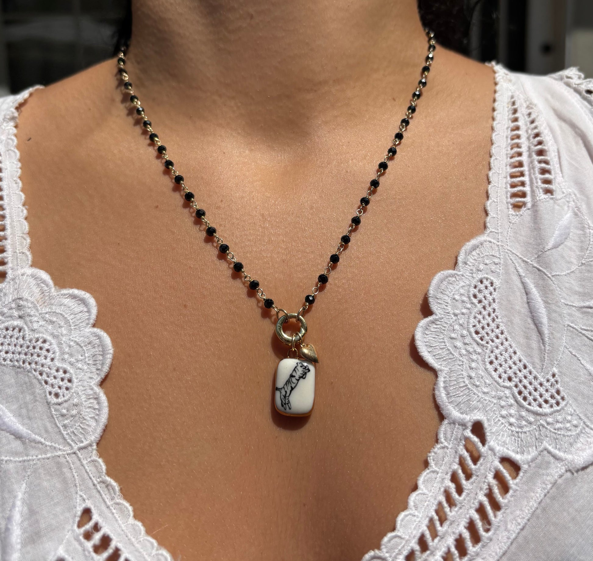 Think of it as a miniature treasure—best worn with care. Treat it like fine china: delicate, beautiful, and meant to be handled gently. While the porcelain and gold-filled components will not tarnish, the 22k gold luster is a delicate finish that can wear over time if exposed to rough handling, friction, or harsh chemicals.